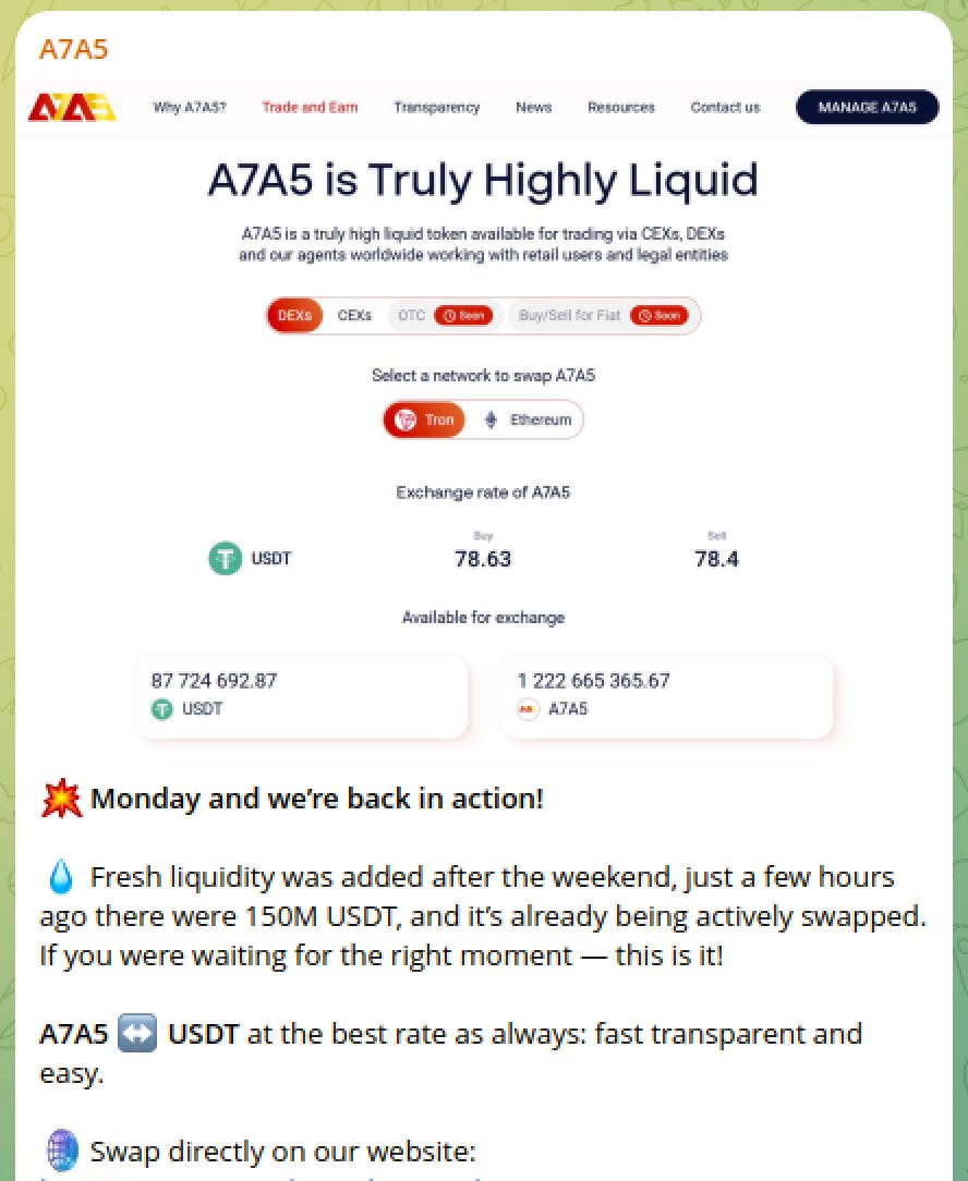 "I don't believe that this is wash-trading. There seems to be genuine demand for USDT, and users are seemingly acquiring A7A5 in order to swap it for this USDT."