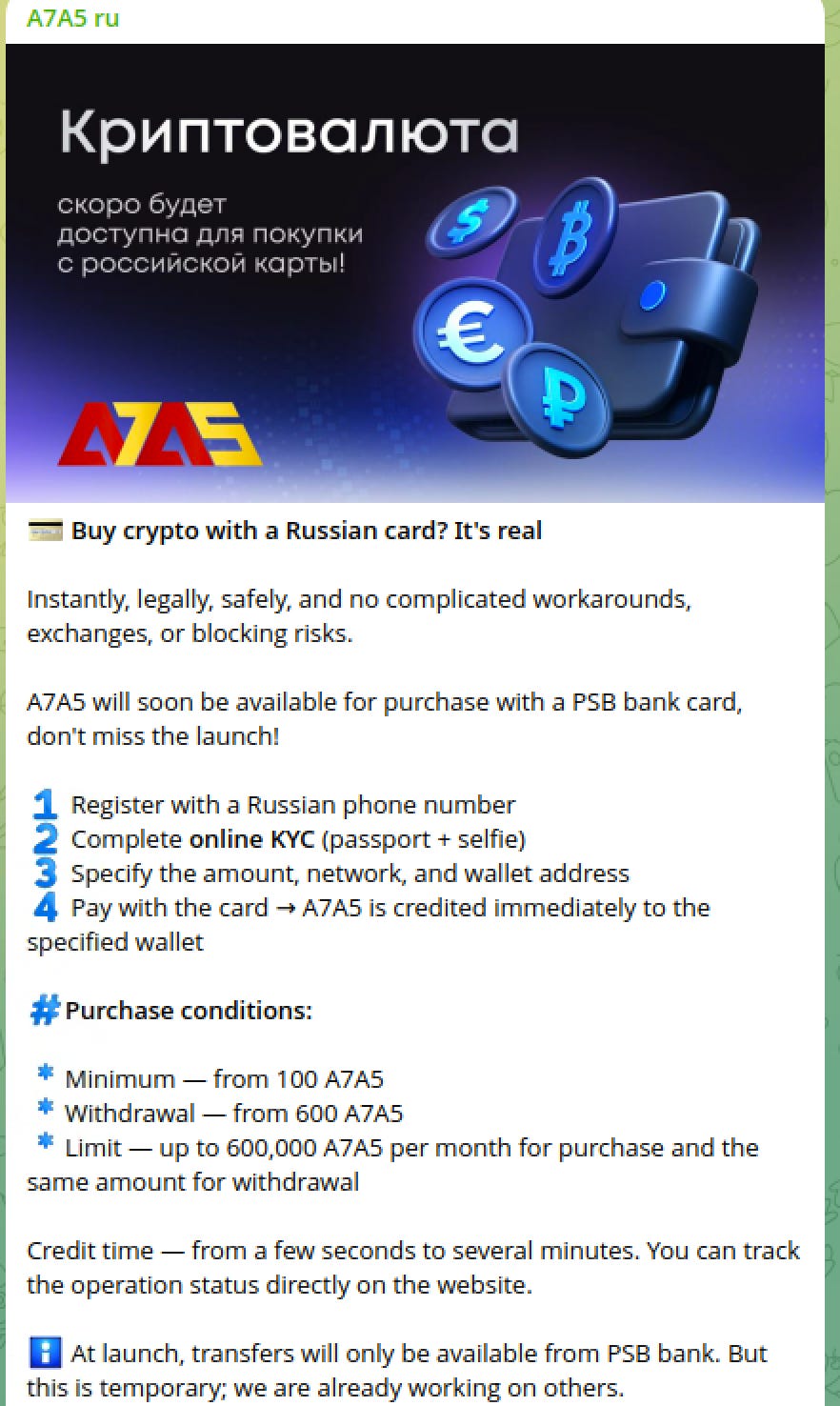 A7A5 is a stablecoin pegged 1:1 to the ruble. This means that (in theory) every time you acquire A7A5 an equivalent amount of rubles are deposited in PSB bank to back the stablecoin.