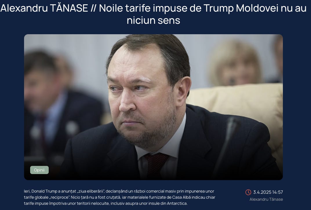 In English, that article is entitled “Alexandru TĂNASE // Trump's new tariffs on Moldova make no sense.” It is an Opinion piece “written” by former Minister of Justice and President of the Constitutional Court Alexandru Tănase.