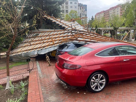 In addition to falling trees, numerous cars were damaged by falling roof tiles blown off of apartment and house roofs onto parking below.