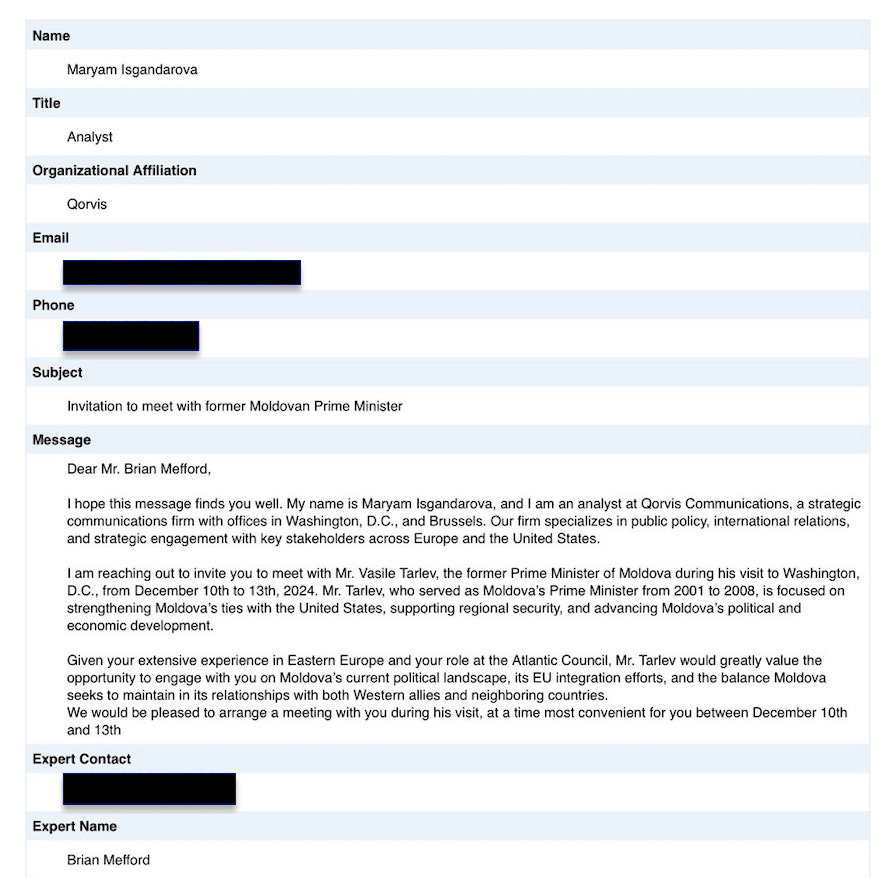 We’ll take a look at this record of outreach in detail below, but first we need to address the fact that it is incomplete. Following the publication of my first investigation into this contract, Nonresident Senior Fellow at the Atlantic Council Brian Mefford shared an outreach email from Qorvis regarding arranging meetings with Vasile Tarlev. You can see this email here: