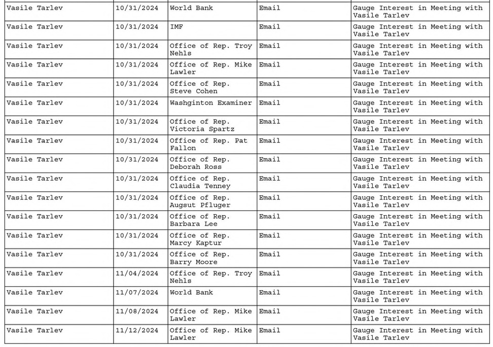 This list includes 18 emails to "Gauge Interest in Meeting with Vasile Tarlev." They were sent to 2 international institutions, the World Bank and the IMF, one newsroom, the “Washginton [sic] Examiner,” and the offices of 11 members of congress. All initial emails went out on October 31, 2024 with apparent followup contacts with a few respondents.