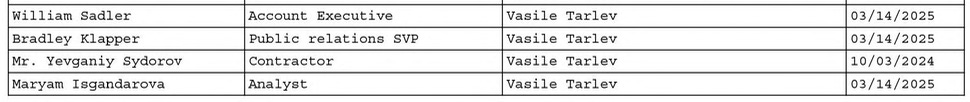 While the records above indicate that at least a few of the contacted people or entities responded to the outreach by email, that’s about it. Mr. Tarlev never made it to the US in December and so none of these meetings ever took place. We can assume that this is the reason that the rest of the $40,000 agreed to under this contract was never paid - though that isn’t explicitly stated anywhere. Qorvis lists 4 employees as having worked on this contract, including Maryam Isgandarova who sent the email to Brian Mefford presented above.