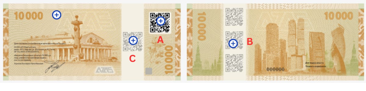 The bills have a scratch off feature similar to a lottery ticket that covers up QR codes A and C. Here are their functions: