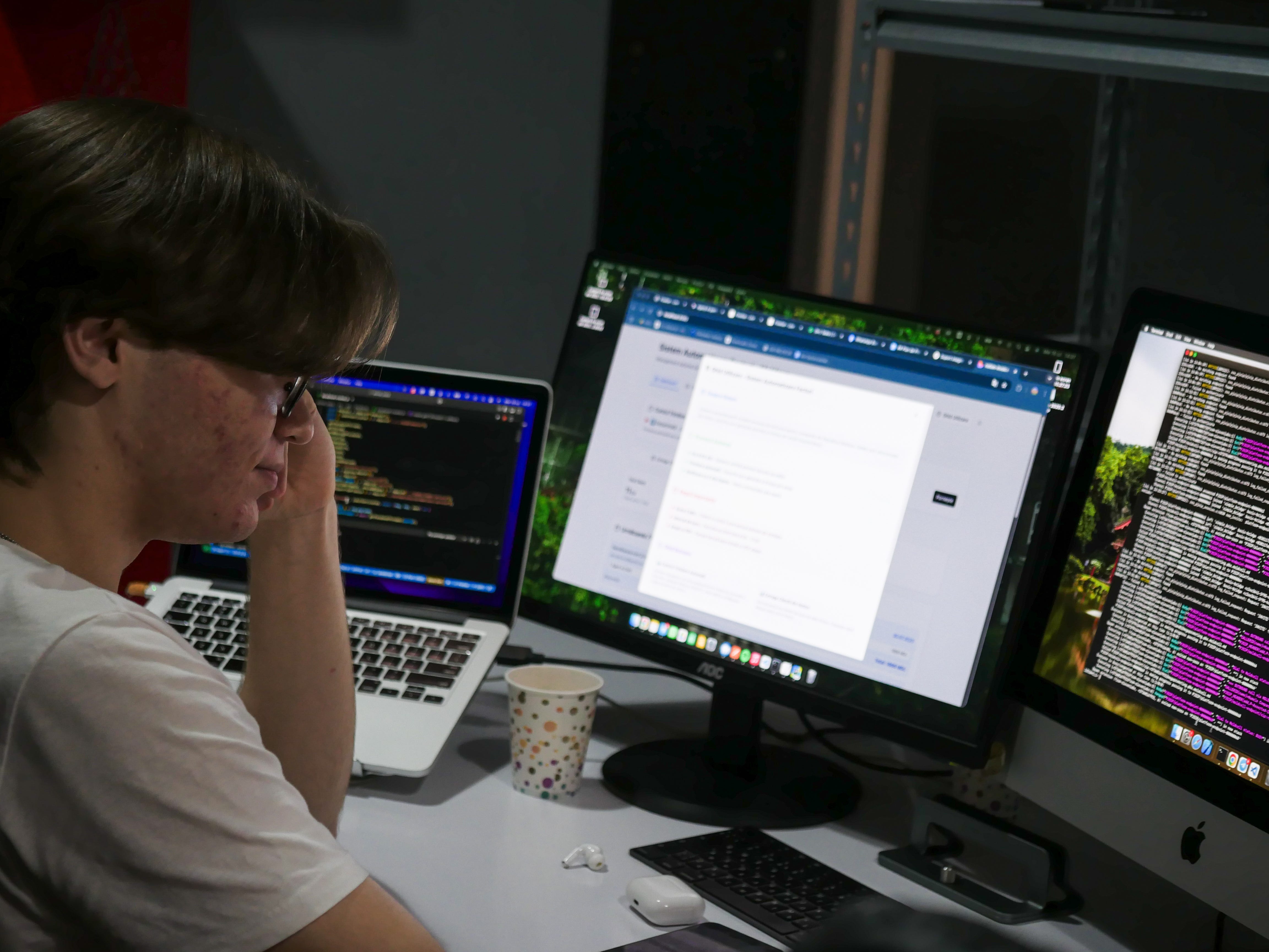 aichat.md operates with a team of ten people. Oleg and Lilia give me a tour through their dim yet spacious office. Programmers are sitting behind multiple screens, tapping on keyboards and chatting with each other.