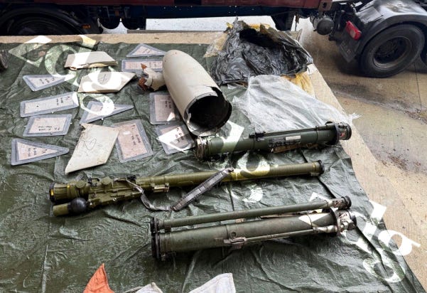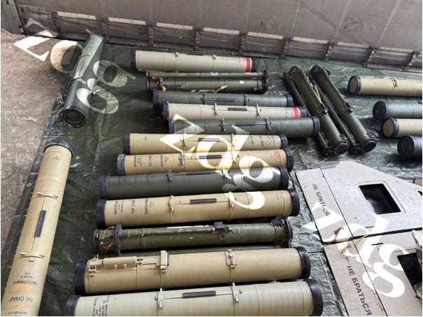 The weapons were Russian / Soviet. They were 18 portable anti-tank missiles (likely 9M133 Kornet / 9K111 Fagot), 8 anti-tank grenade launchers (likely RPG-26 / RPG-27), a man portable air defense system (MANPADS - likely a 9K38 Igla), and parts of a Geran 2 drone. “Likely” here means that this is the identification of weapons experts from the photos, not officially confirmed by the prosecutors office.